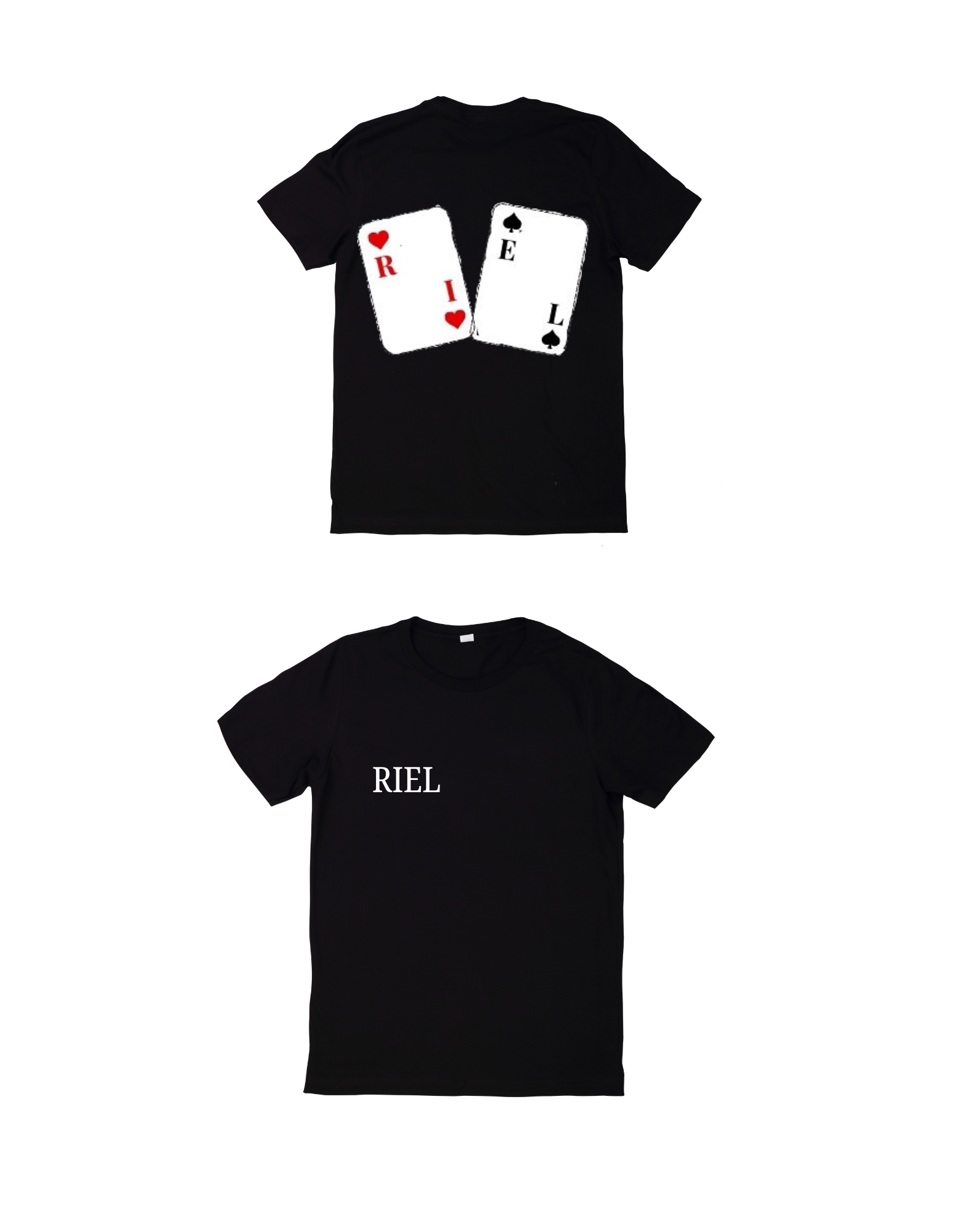 A high quality 100% cotton black graphic t-shirt with two cards spelling "RIEL" on the back and "RIEL" written on the chest.